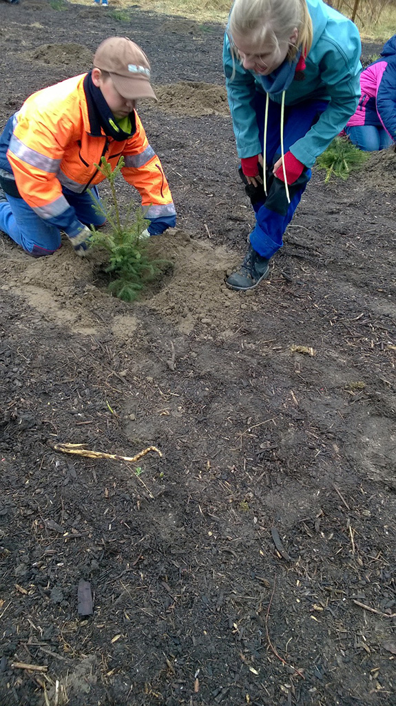 Das Loch hat Waldarbeiter Helmut Nitschke vorher mit einer lautstarken Maschine in den Boden gebohrt. Nun halten sich Alina und Nele beim Pflanzen genau an die Instruktionen von Förster Ulf Wosnizek: schön gerade halten, aufpassen, dass die Wurzeln nicht verklemmen, das Erdreich locker drum herum, den Wurzelhals hinein ins Erdreich, dann einen Gießrand lassen.