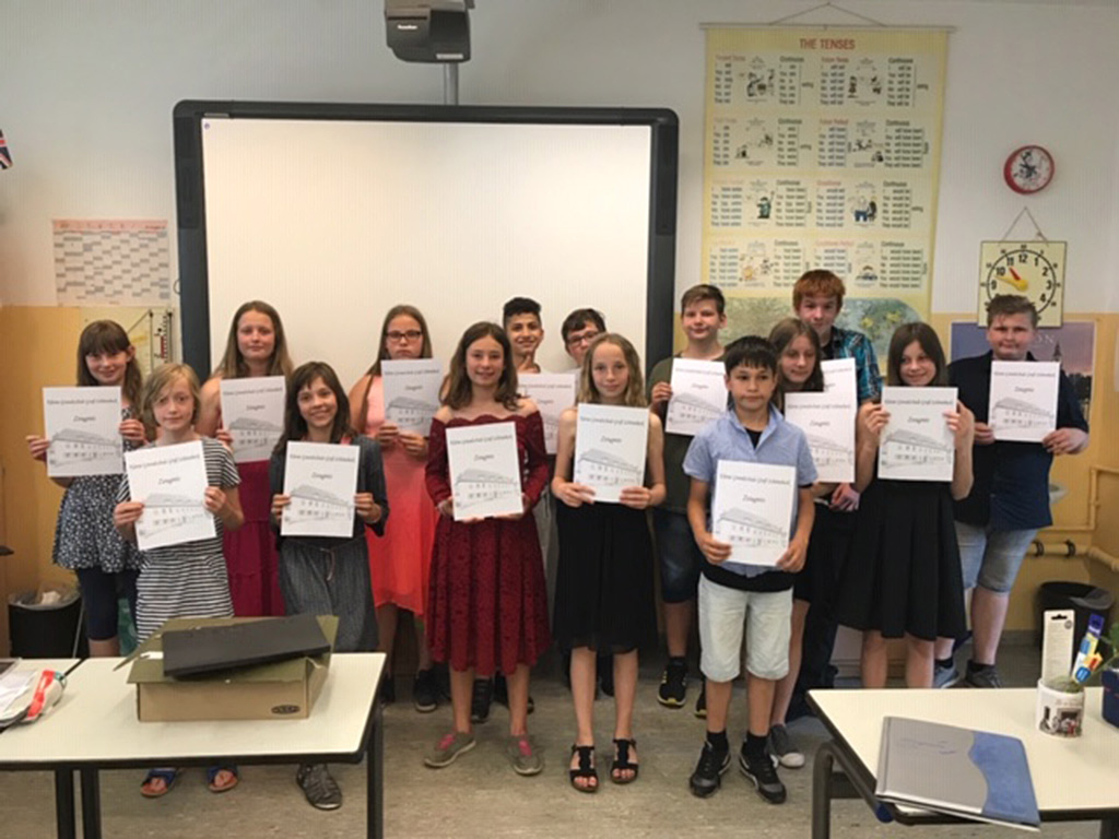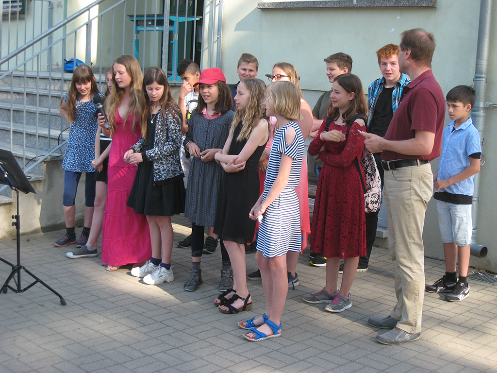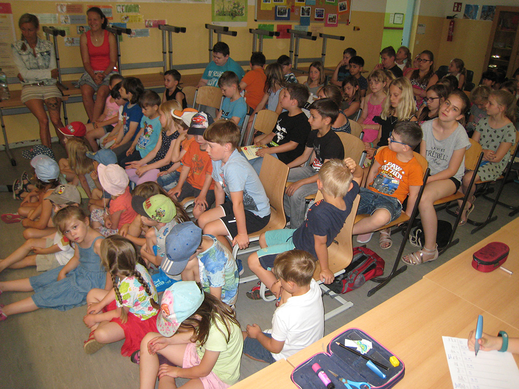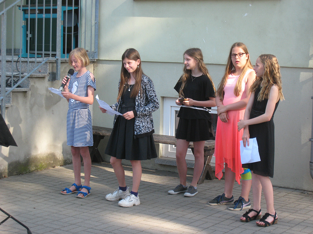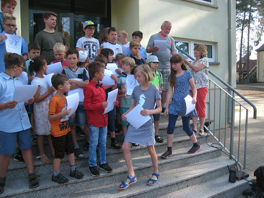 Nach ihrer Abschlussfeier am Dienstag im Jugendzentrum – vielen Dank an Melanie, die uns die Übernachtung ermöglichte und den Grillmeister Herrn Miether- und einem gemeinsamen Frühstück verabschiedete sich Klasse 6 mit einem kleinen Programm von der Grundschule. Für sie wird es nach den Sommerferien an den weiterführenden Schulen weitergehen. So sangen sie mit Herrn Bollmanns Hilfe „Muss ich wirklich schon gehen“ und bedankten sich mit kleinen Gedichten bei ihren Lehrern. Als dann alle Schüler ihre Zeugnisse in den Händen hatten, ging es in die wohlverdienten Ferien. Beim Abschied der Schülerinnen und Schüler floss dann doch die eine oder andere Träne – für sie ging ein wichtiger Abschnitt zu Ende.