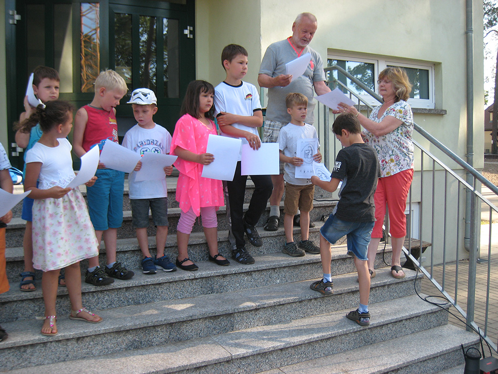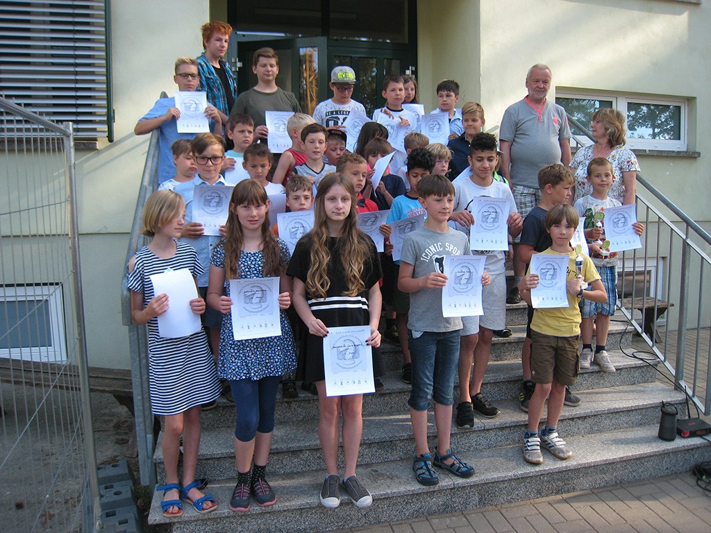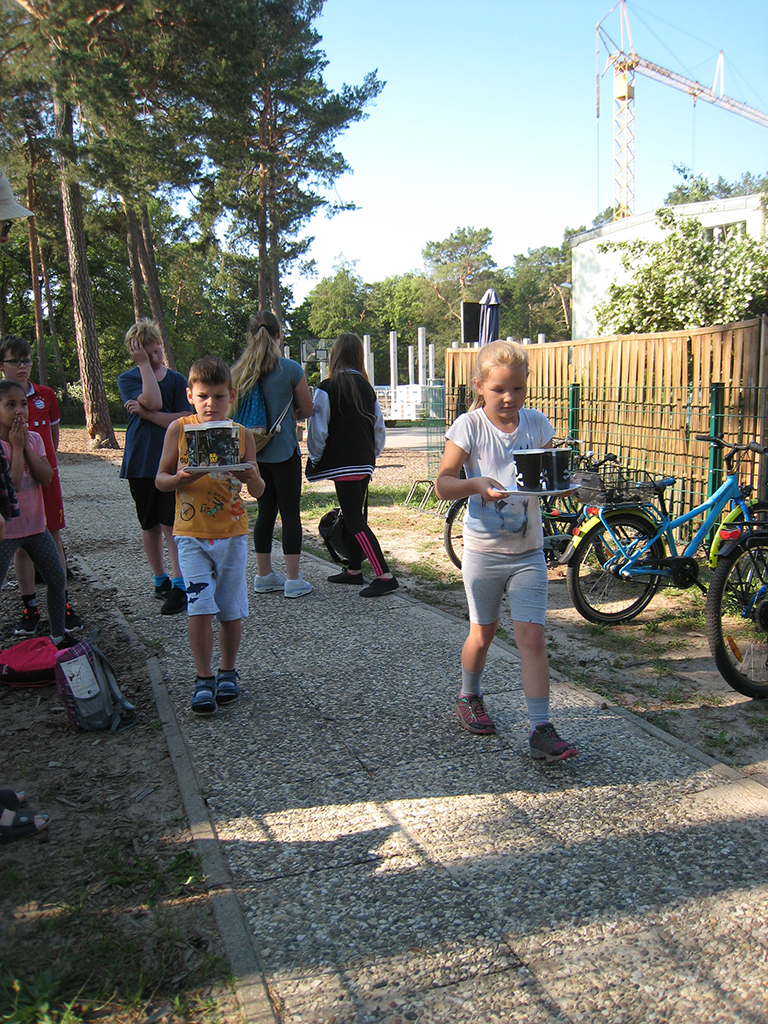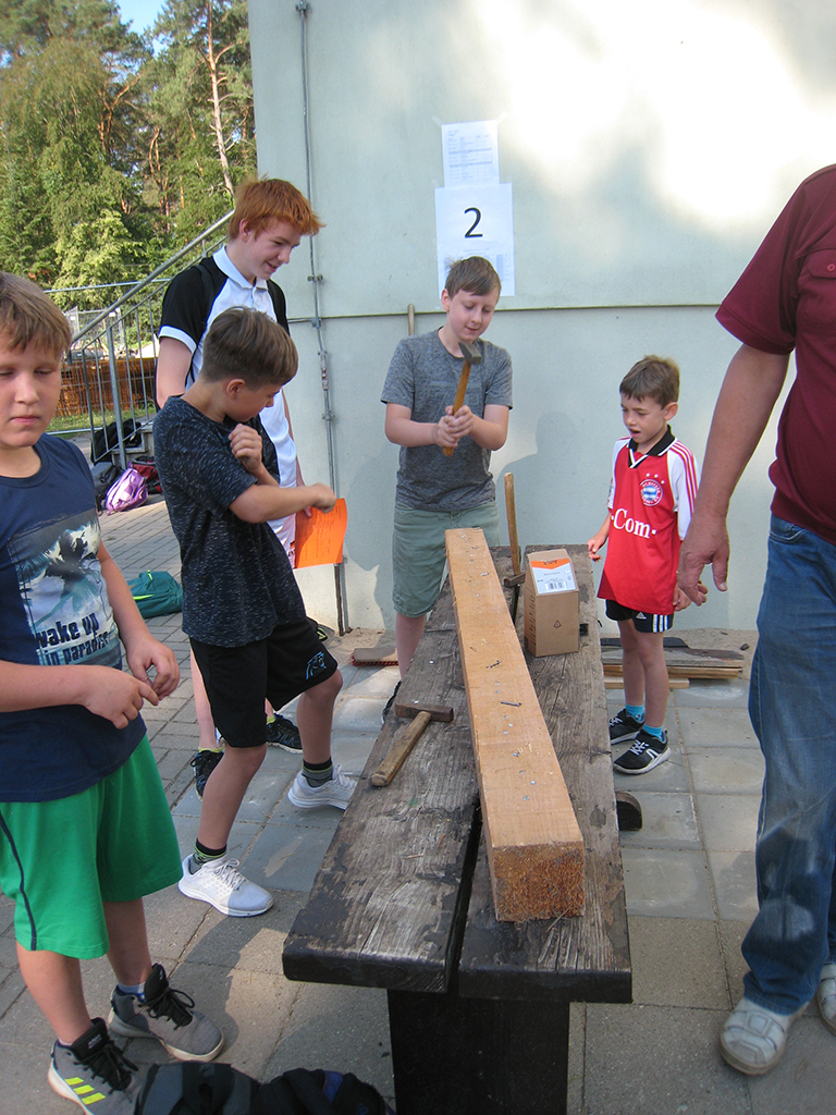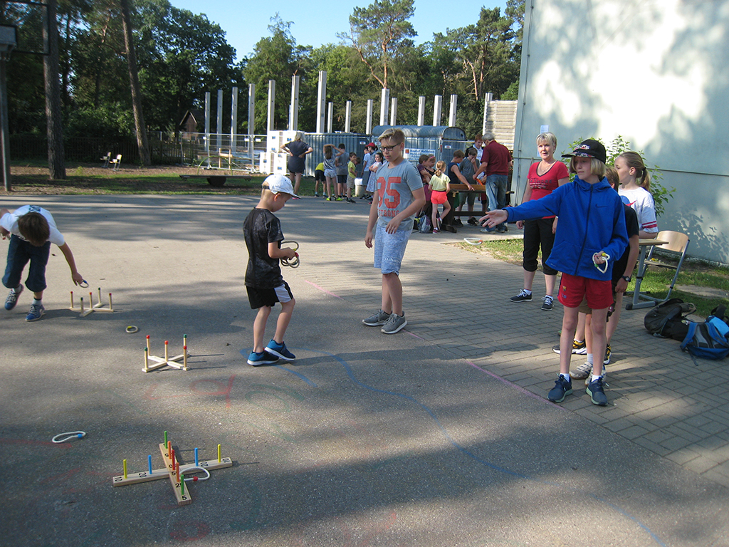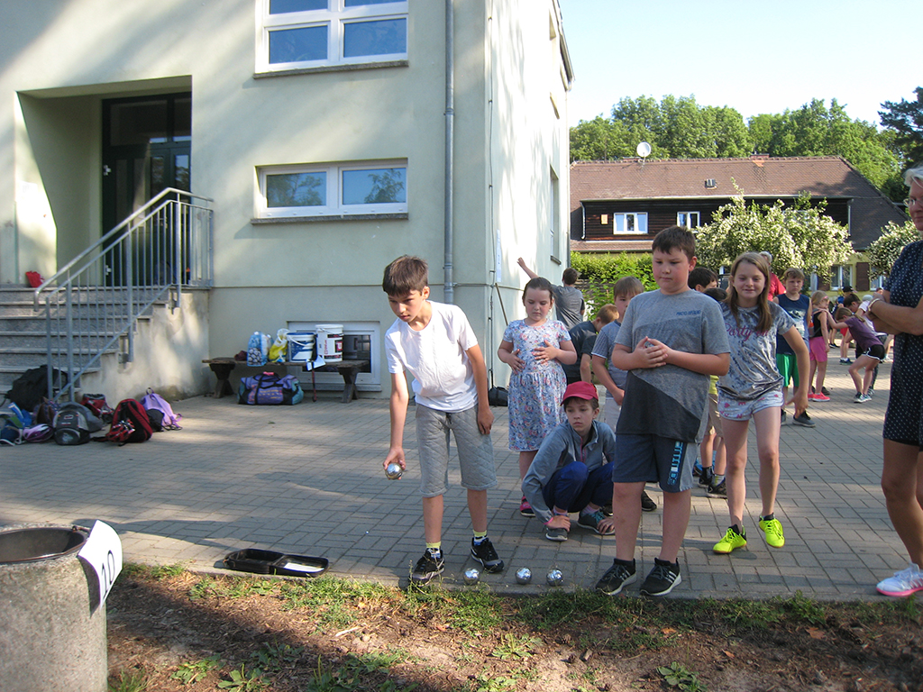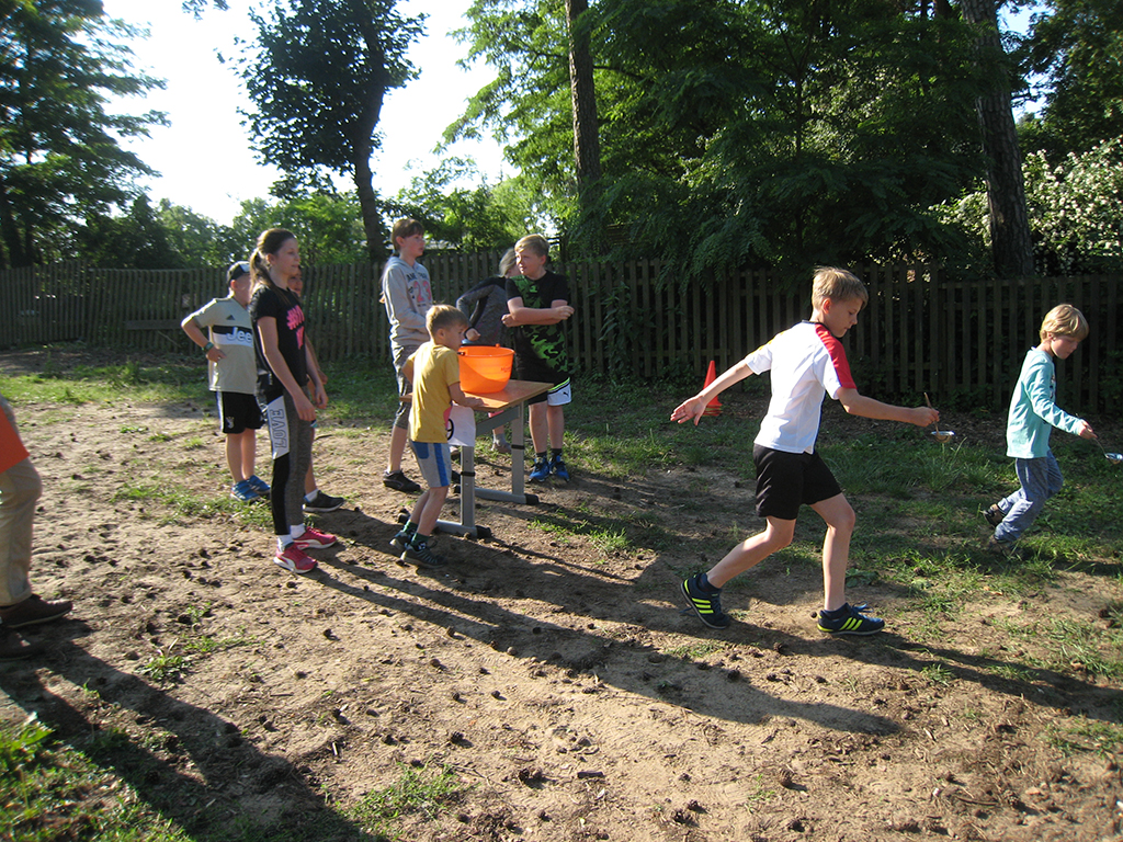 Am Montag wetteiferten beim Funsportfest altersgemischte Gruppen in Disziplinen wie Teebeutelzielwerfen, Wetthämmern, Boule, Wassergeschicklichkeitswetttragen oder Ringe werfen um die besten Ergebnisse. Aber auch beim Tischtennis, Wasserbecherfüllen, Riesenmikado, Dosenwerfen und einem Quiz waren Können und Wissen gefragt. Herr Rütz untermalte alles mit Musik. Wir danken Frau Müller, Frau Baumert und Frau Haupt für ihre Hilfe und Unterstützung.