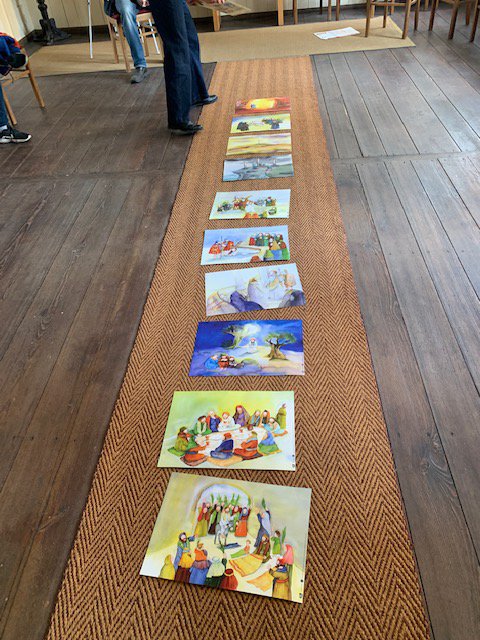 Nach dem Start in der Kirche und dem Betrachten der Kreuze, legten die Schüler den Verlauf der Karwoche mit Bildern. Fragen konnten gestellt werden und das Wissen gezeigt werden, dass sich die Schüler in Kurzvorträgen zum Thema angeeignet hatten.