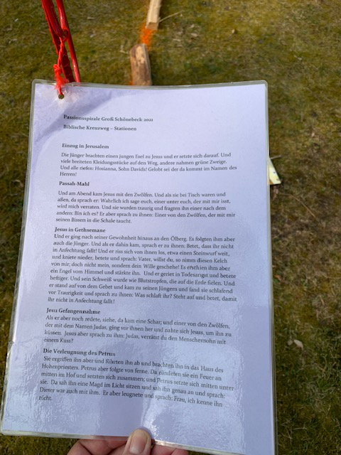 Jeder Besucher kann in der Karwoche die Spirale vor der Kirche ablaufen und findet auf einem Handout Informationen zu den einzelnen Stationen. Wir bedanken uns bei Frau Müller und Herrn Weißflog für diesen interessanten Tag und wünschen Frohe Ostern.