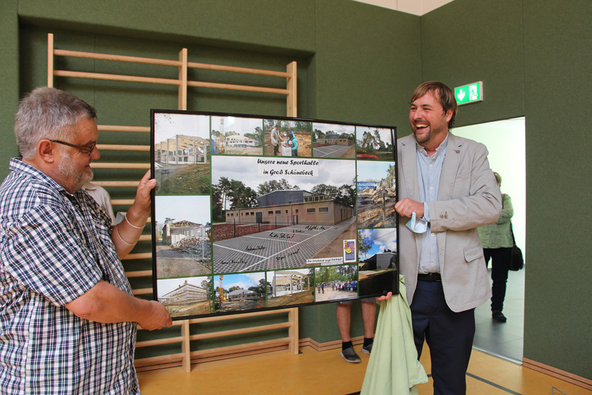 Besondere Freude stand Groß Schönebecks Ortsvorsteher Andreas Zeidler im Gesicht, der als Schulkind selbst noch in der alten Halle Sportunterricht hatte. „Der Neubau ist eine große Bereicherung für unseren Ort. Ich bedanke mich bei allen, die das möglich gemacht haben“, sagte er. Gemeinsam mit seinem Vorgänger Hans-Joachim Buhrs übergab er eine Fototafel von den Bauarbeiten und mit dem Dank des gesamten Ortsbeirates.