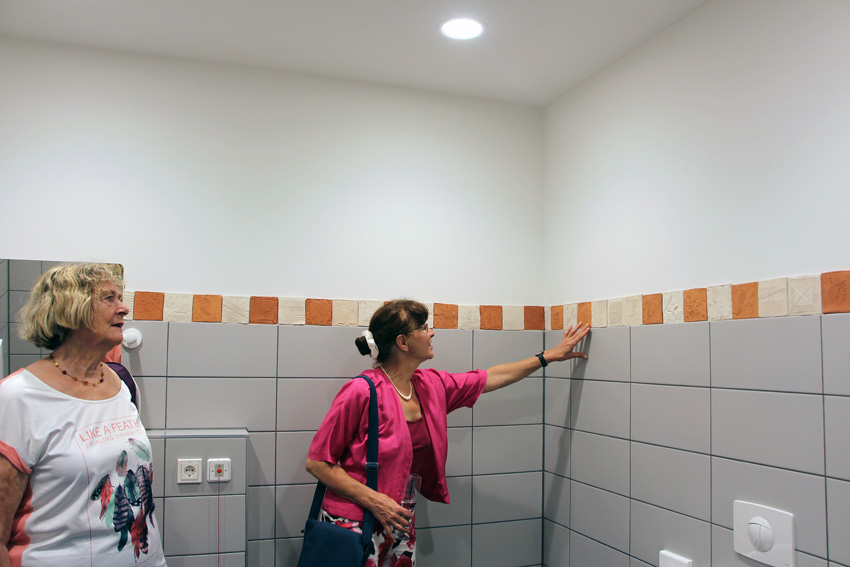 Beteiligt waren aber auch Schüler aus der Grundschule des Ortes. Sie töpferten in einem Schulprojekt Fliesen aus rotem und weißem Ton mit sportlichen Motiven. Insgesamt 218 handgefertigte Kacheln wurden in den Sanitär- und Aufenthaltsräumen als Freis über den Fliesensockeln angebracht.
