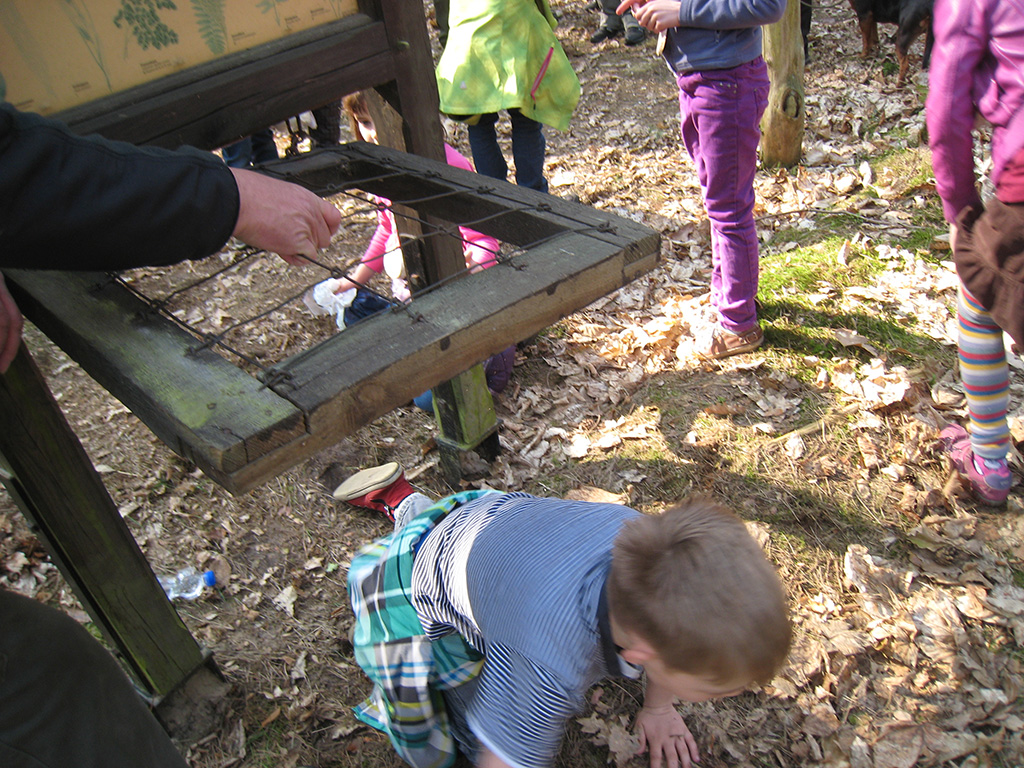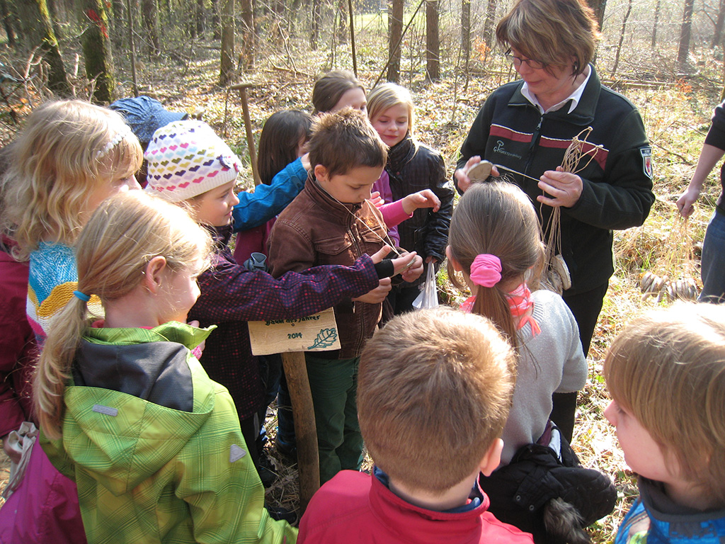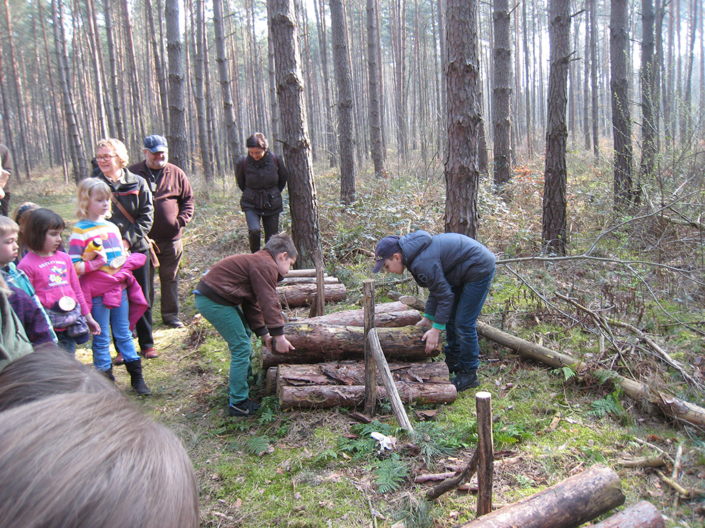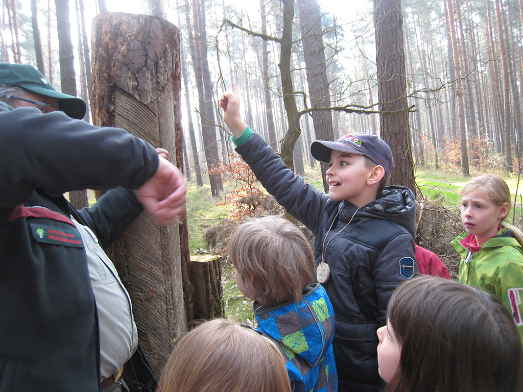 Die stärksten Jungs werden gebraucht? Nick und Maximilian melden sich. Im Revier Prötze ist Brennholz zu stapeln. Die zwei krempeln die Ärmel hoch. An den ein Meter langen Stammstücken haben sie ordentlich zu ackern. „Waldarbeit“ heißt die Station, an der sich die Jungs zu schaffen machen. Eine andere heißt „Sauklappe“. Indem man den Eichenwald durch die Klappe betritt, kann man dort mal die Wildschweinperspektive einnehmen. An einer weiteren Stelle lässt sich ein Baumtelefon testen – an den zwei Enden eines dicken Stammes. Denn Holz leitet die leisesten Geräusche.