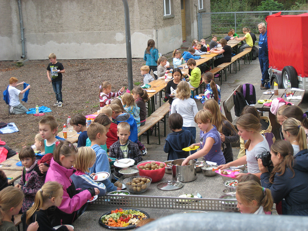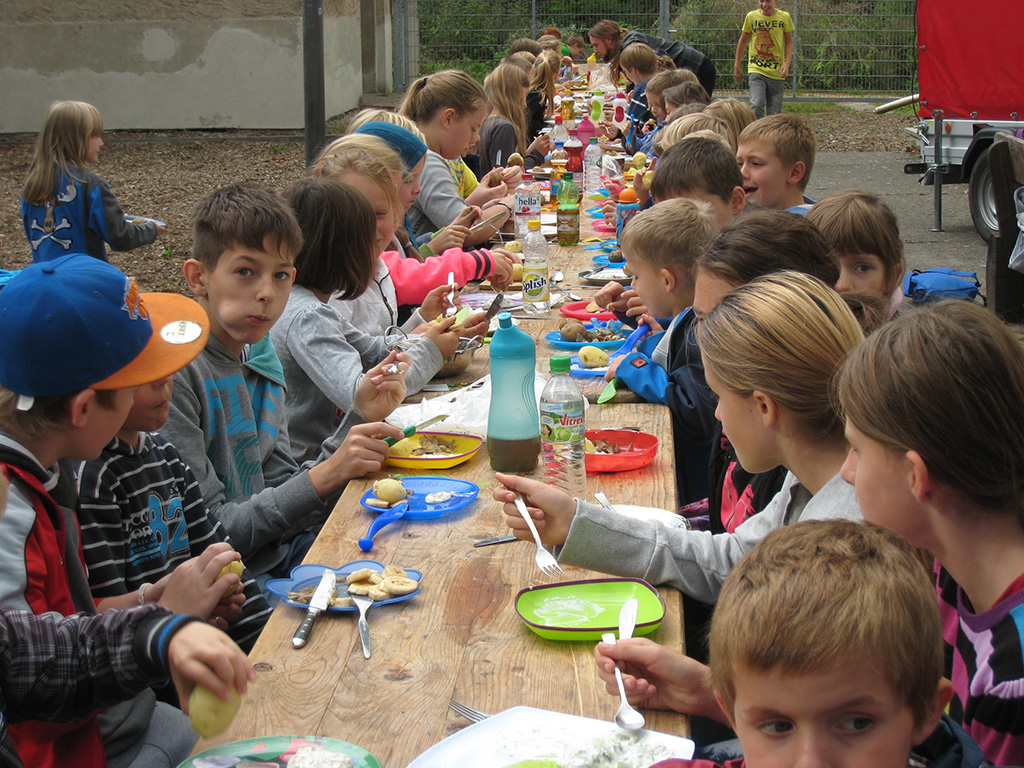 Am Ende eines abwechslungsreichen Vormittages saßen wir dann an einer langen Tafel auf dem Schulhof, es gab wieder Pellkartoffeln mit super leckeren Dips, tollen Spießen und liebevoll angerichteten Obst- und Gemüseplatten.