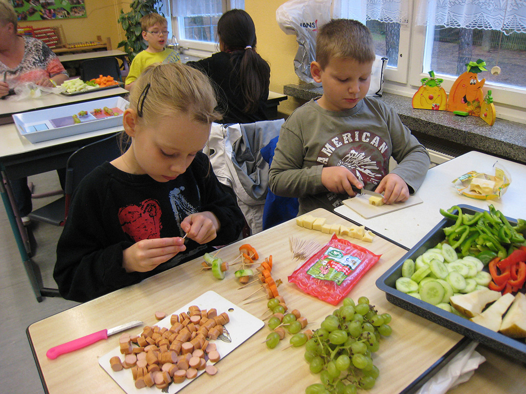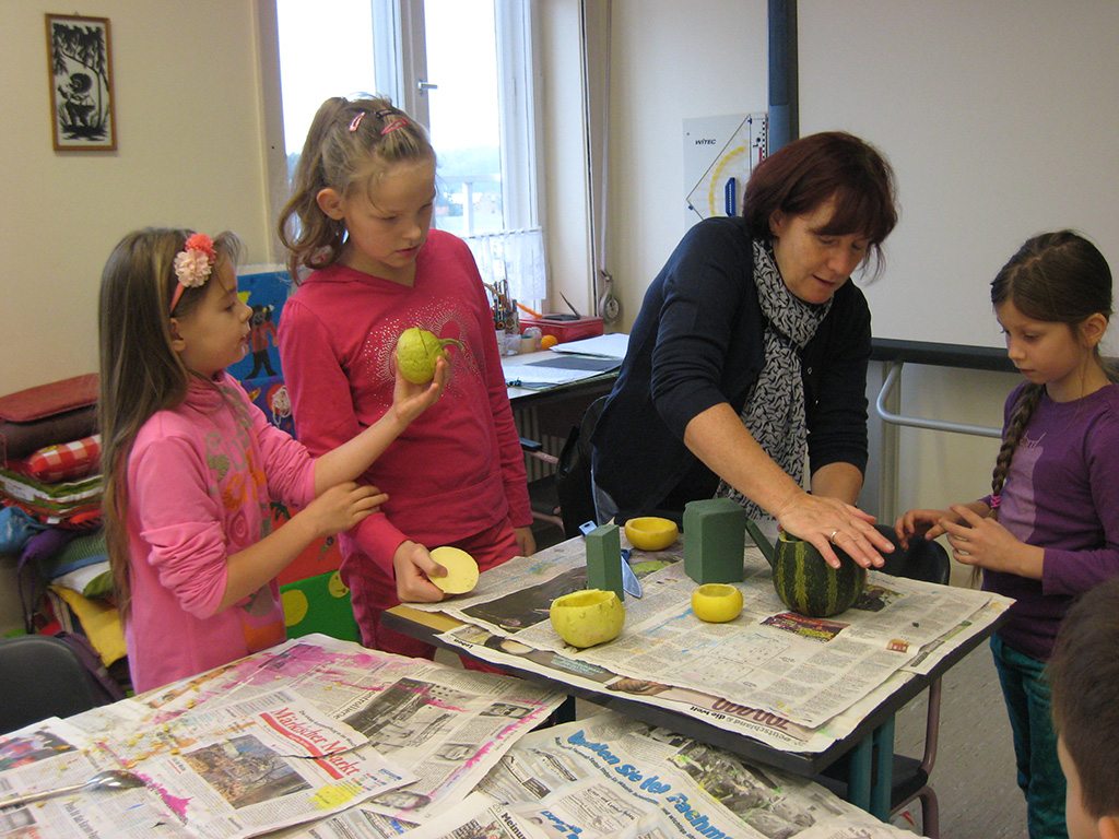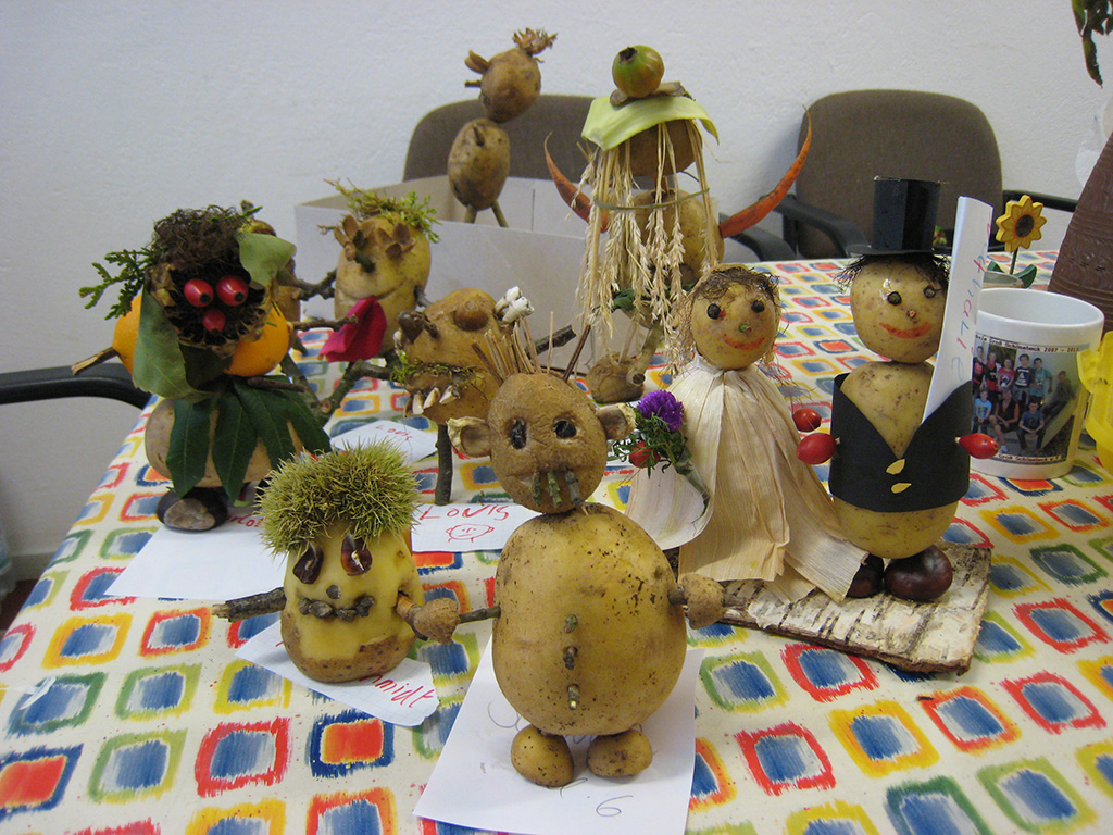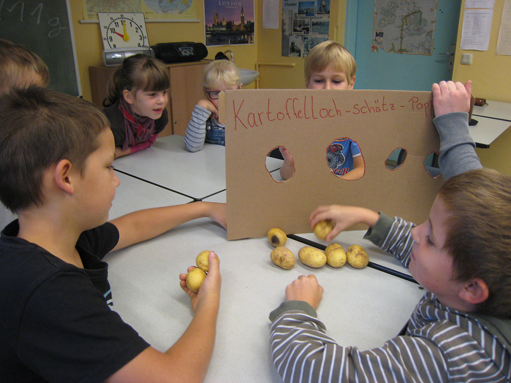 Es wurde gebastelt, gemalt, geschnippelt, gerührt und ein tolles Frühstück vorbereitet, über das sich in der Pause alle hermachten. Es entstanden tolle Tischdekorationen für das Hoffest bei Herrn Bohm, in der ortsansässigen Landtheke wurde sich über heimische Produkte informiert und in der Turnhalle gab es lustige Staffelspiele. Mein Gewicht in „Kartoffeleinheiten“ umgerechnet, das wurde bei Martin ermittelt, ein neues Beet wurde auf dem Schulhof angelegt, dass uns hoffentlich im Frühjahr mit Tulpen erfreut. Mit guten Ideen und Kreativität wurden Fotos gemacht , um das Wachsen der von uns gepflanzten Obstbäume in der Apfelallee zu dokumentieren.