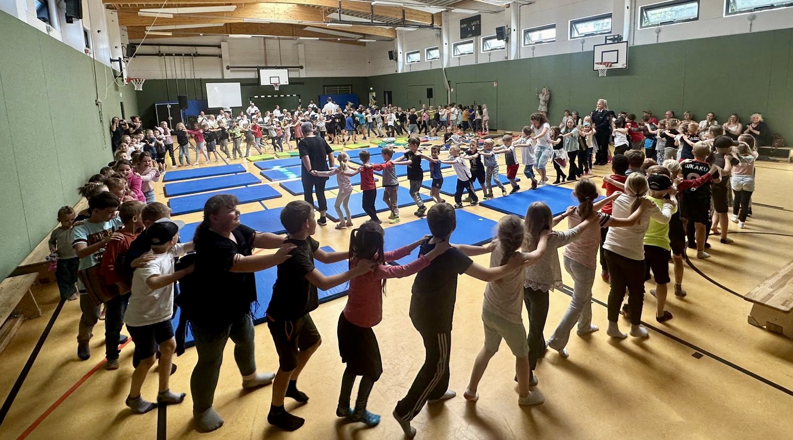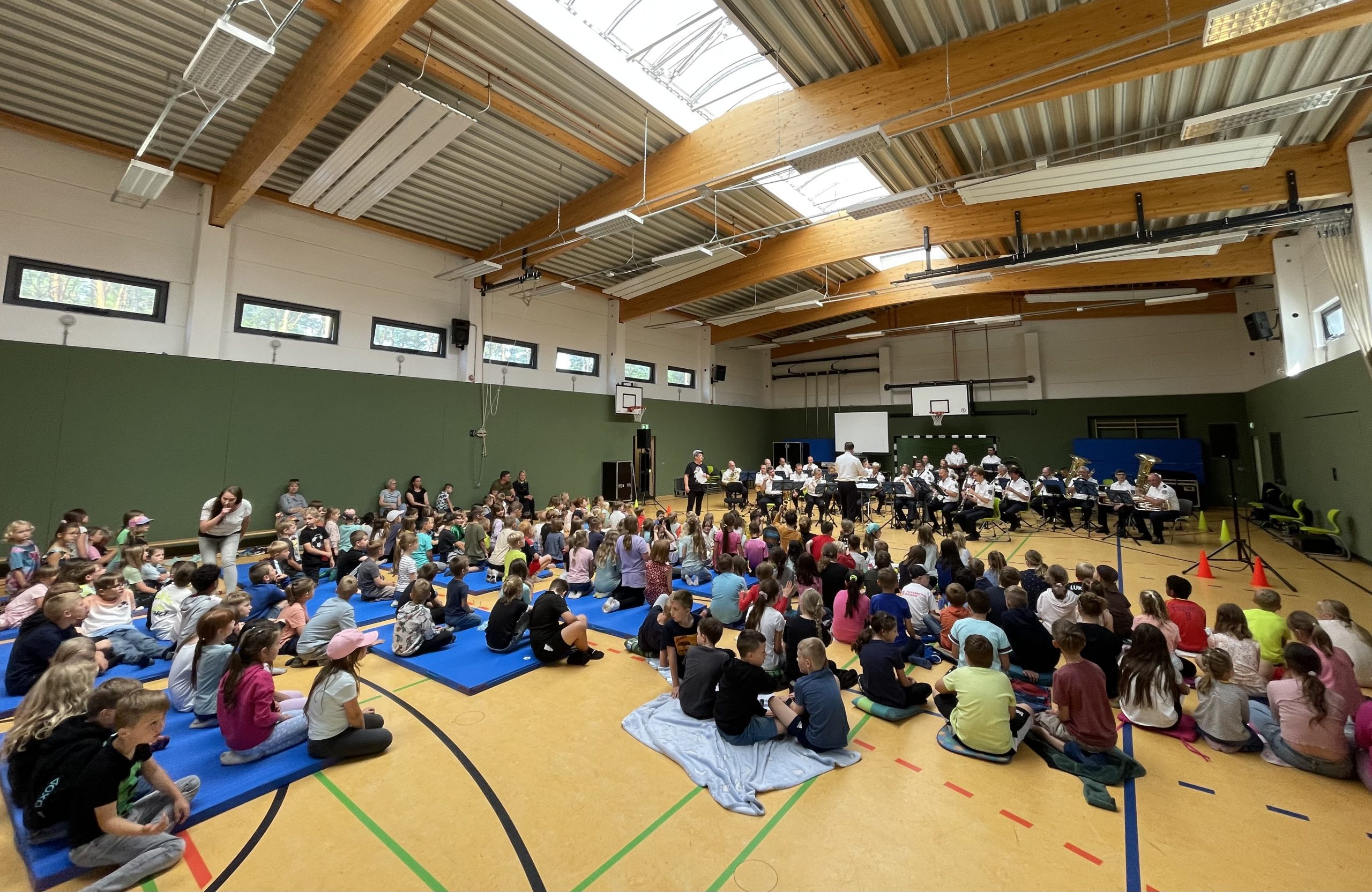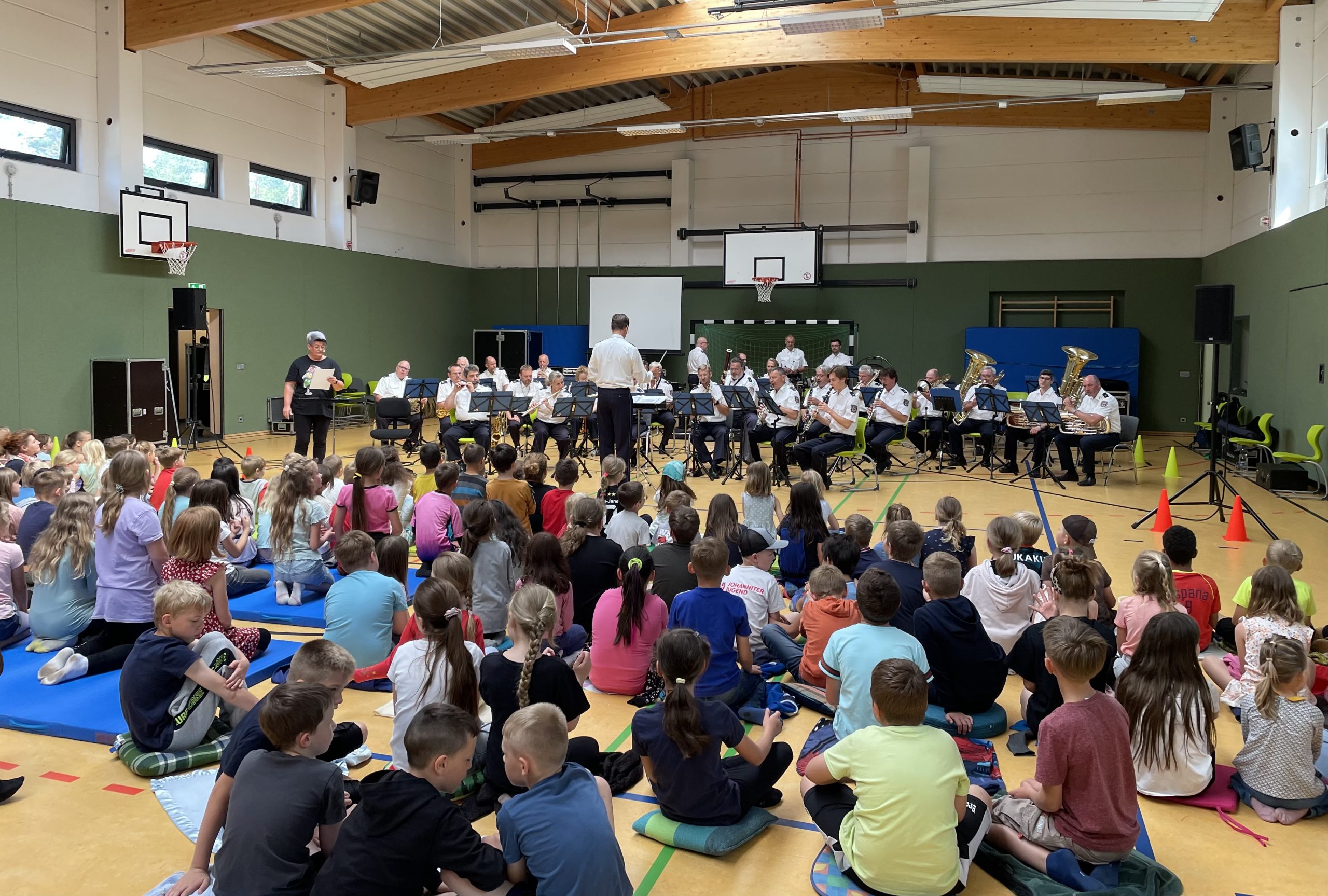 Eine Musikstunde der ganz besonderen Art bot die Polizei Brandenburg am Donnerstag, den 20.06.2024 den Schülern der Klassenstufen 1-6 unserer Grundschule. Das Landespolizeiorchester – das musikalische Aushängeschild der Polizei in Brandenburg – war auf Einladung der Schule sowie Anforderung durch die Prävention der Barnimer Polizei vorbeigekommen, um gemeinsam mit den Kindern und Jugendlichen zu musizieren. Die 46 Berufsmusikerinnen und Berufsmusiker boten den Kindern einen ganz besonderen Zugang zur Musik, der Instrumenten- und Klangvielfalt.
