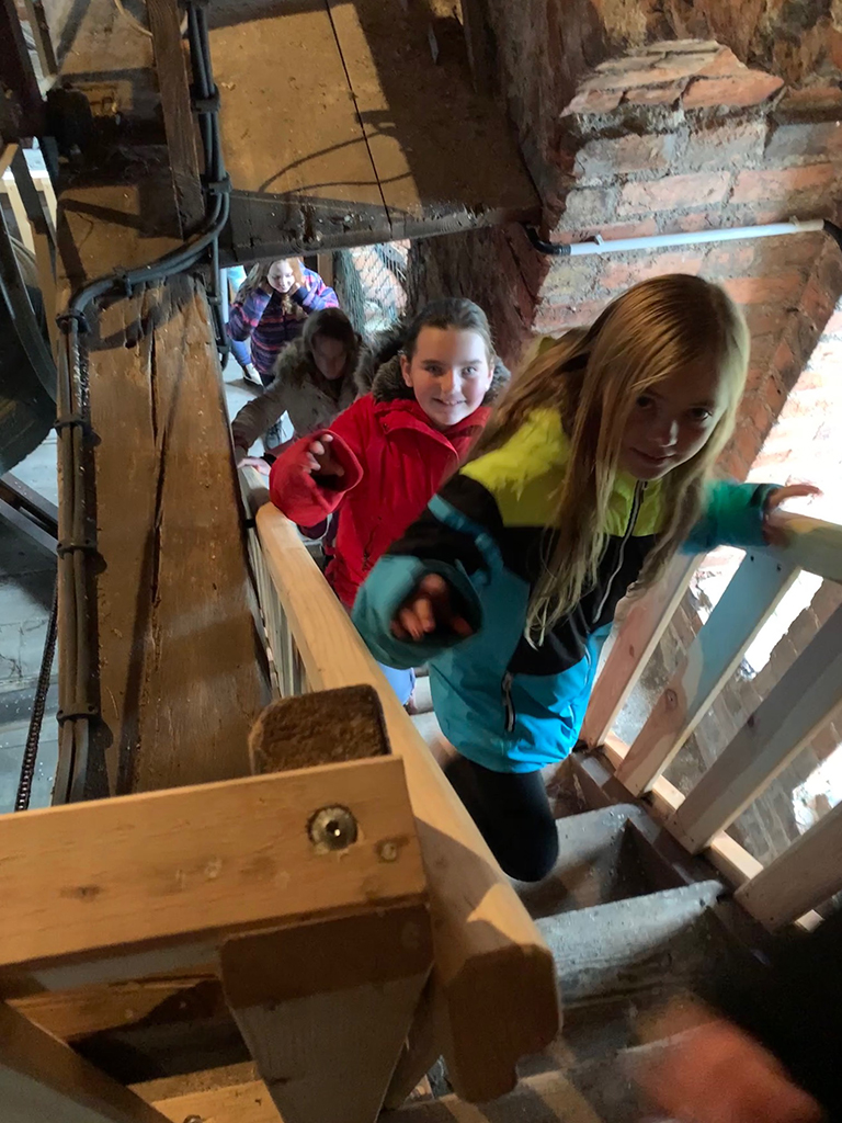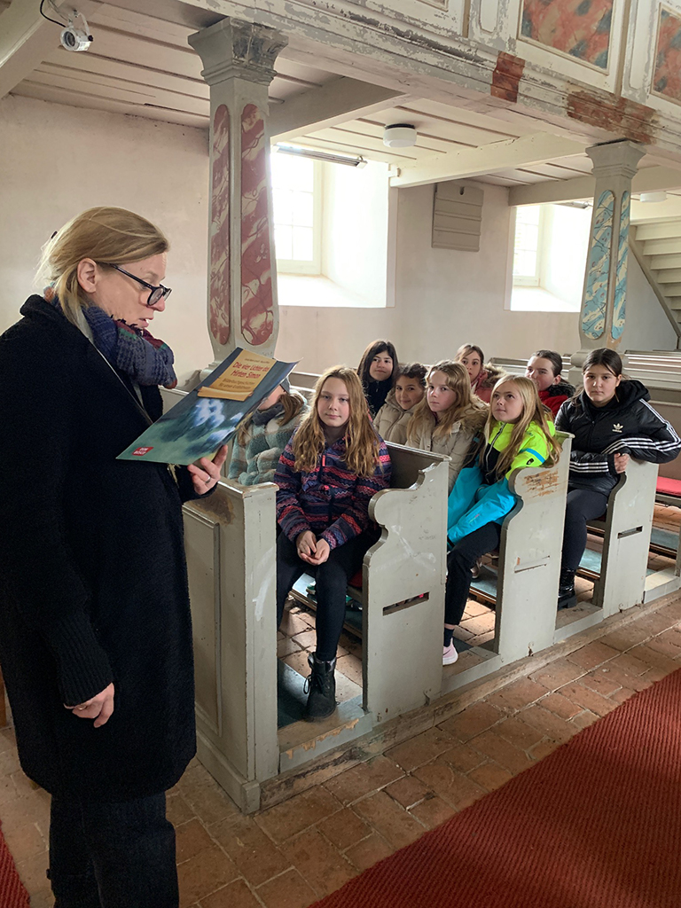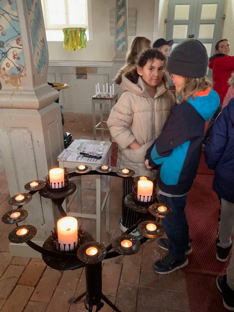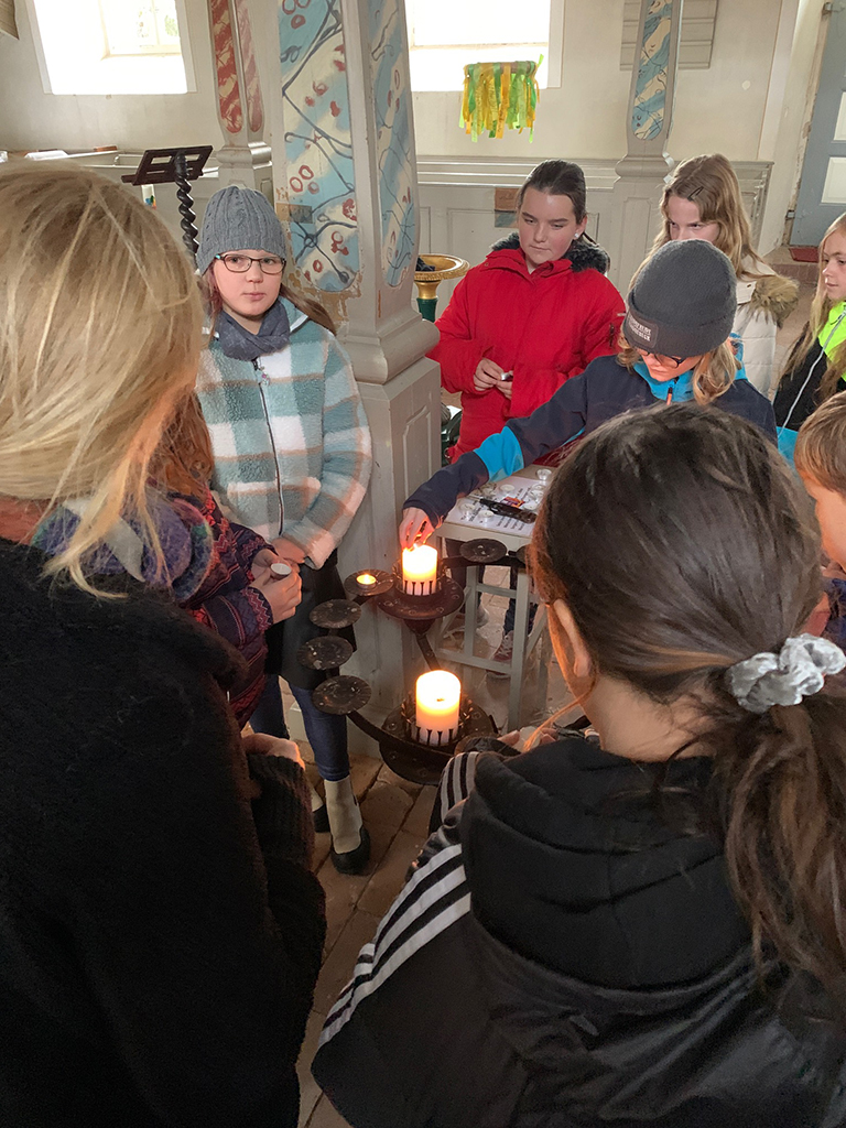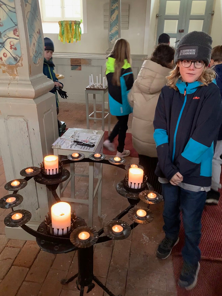 Am 24.11.22 besuchten Klasse 5 und 6 im Rahmen des LER-Unterrichts und in Fortsetzung eines Projekts die Kirche in Groß Schönebeck. In 2 Gruppen geteilt besichtigten wir den Innenraum der Kirche und bestiegen den Kirchturm. Frau Müller las eine Geschichte zur Weihnacht vor, wir sprachen über den Totensonntag und zündeten eine Kerze zum Gedenken an. Frau Pferdt und Herr Schüler begleiteten uns auf den Turm, die enge Treppe hinauf, an der Glocke vorbei. Oben angekommen suchten viele Schüler ihr Zuhause. Da die Mauersegler derzeit nicht in ihren Brutkästen sind, konnten wir auch dort einen Blick hineinwerfen. Wieder unten angekommen, spielte Herr Schüler noch Weihnachtslieder auf der Orgel für uns. Das war ein schöner Abschluss für diesen Besuch.