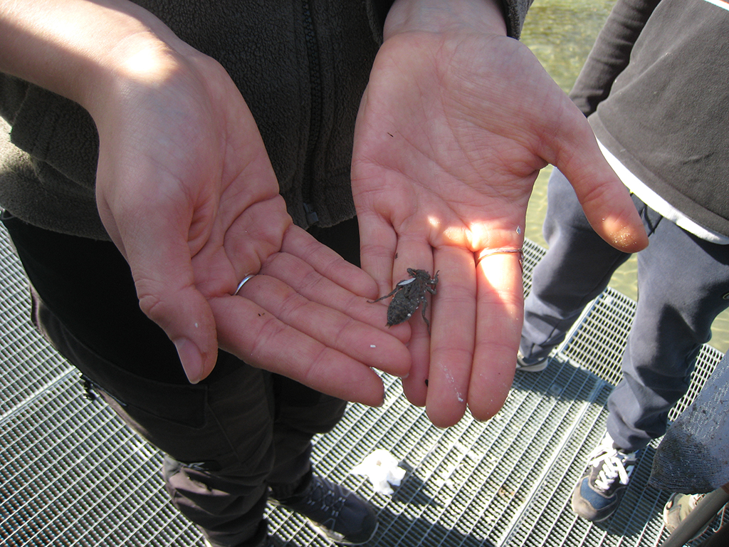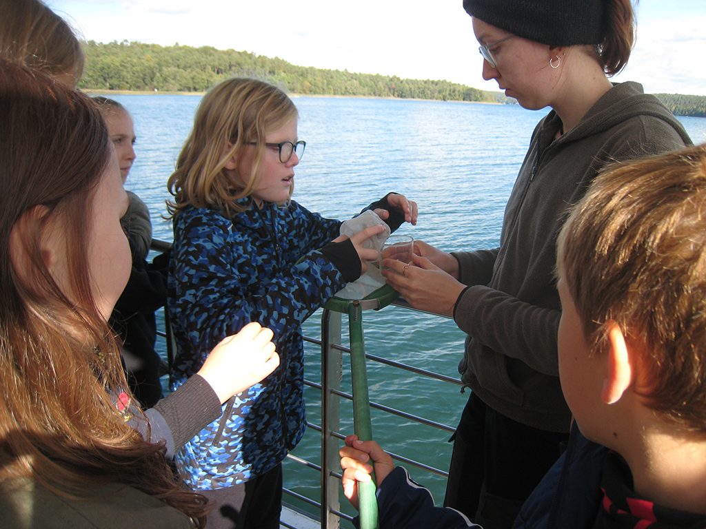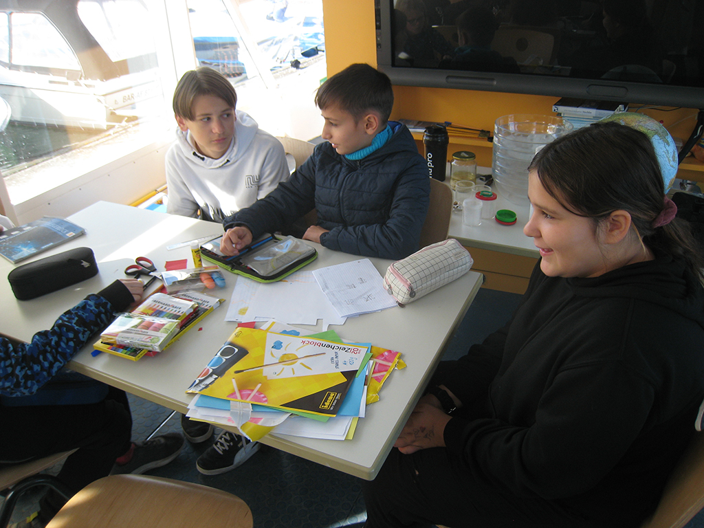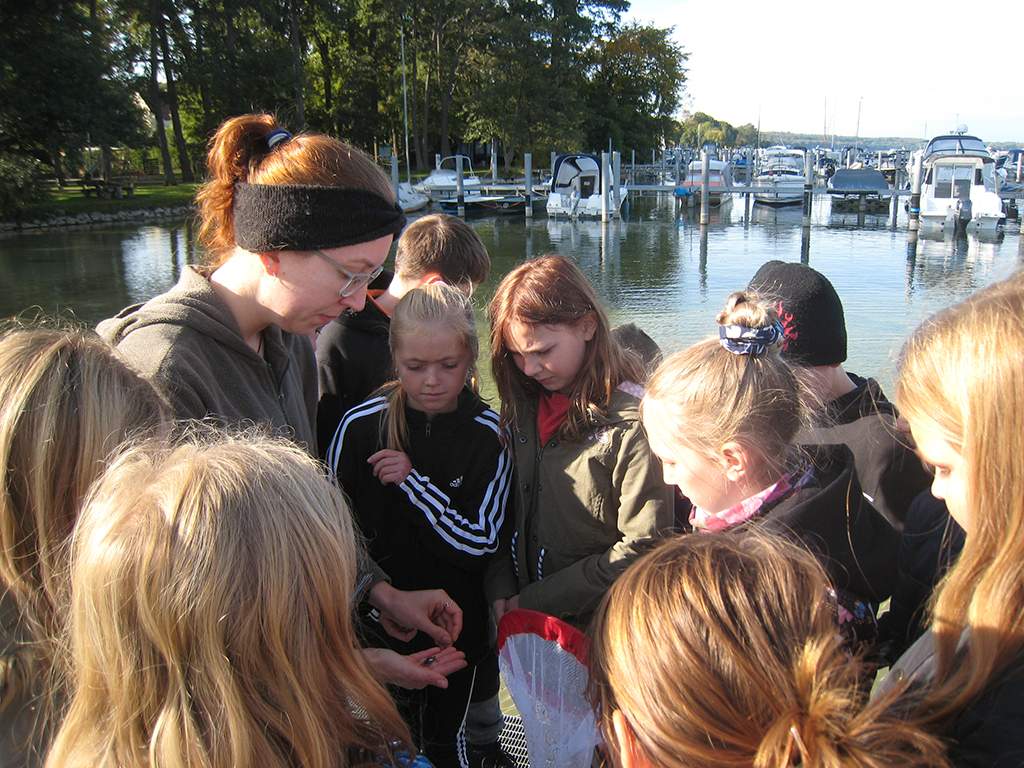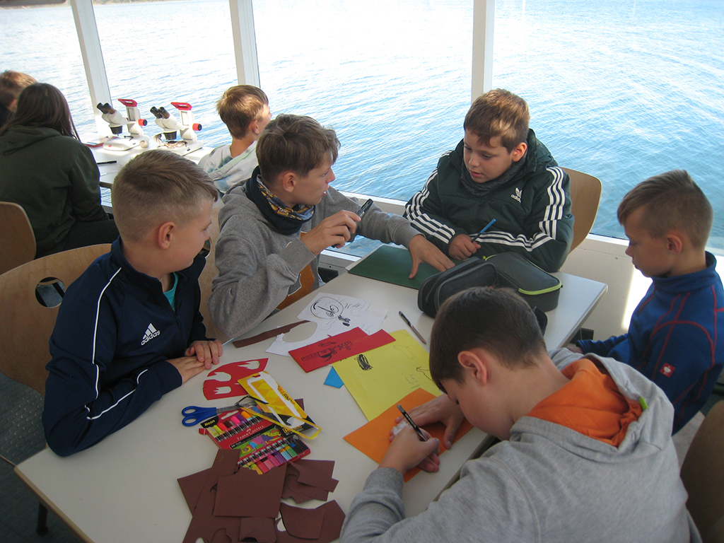 Zuerst wurden an der Anlegestelle einige Fragen des Klimawandels besprochen und mit dem Kescher erforscht, was an Kleintieren im Wasser zu finden ist. Eine Gruppe fand die Larve einer großen Libelle oder auch Muscheln und Wasserflöhe.