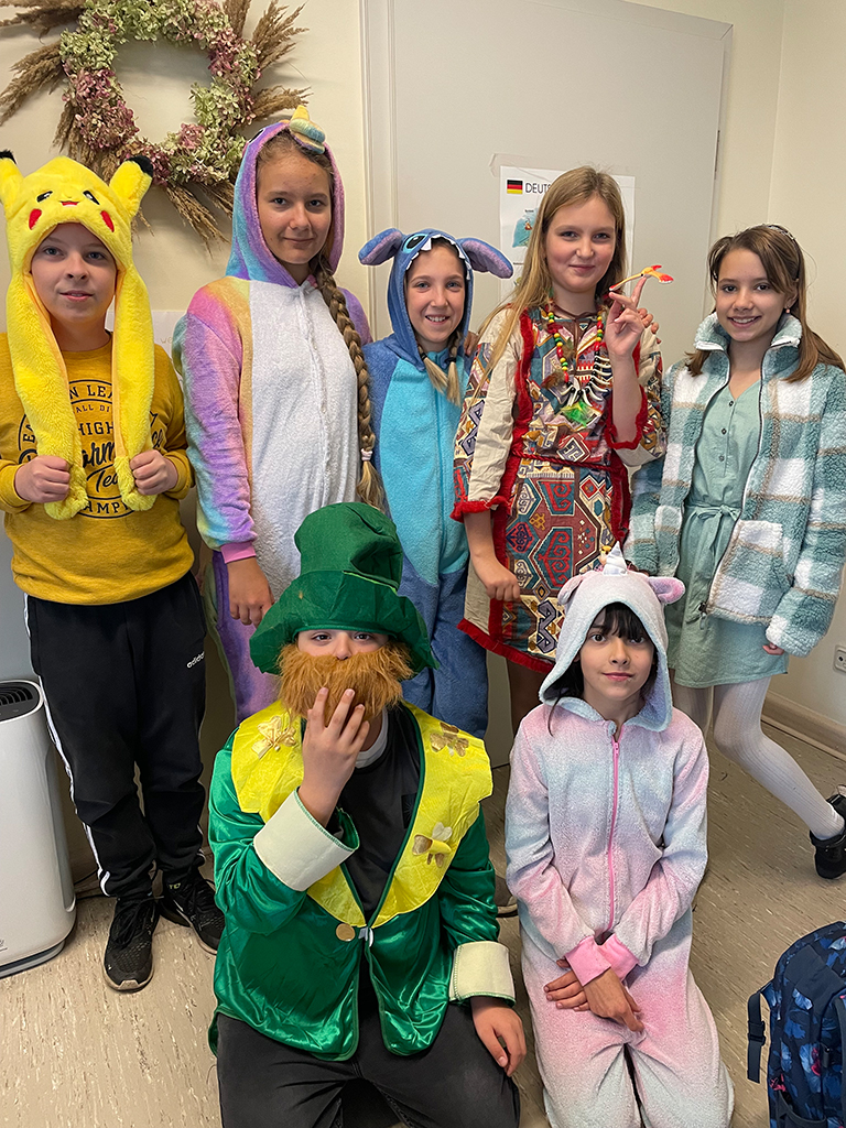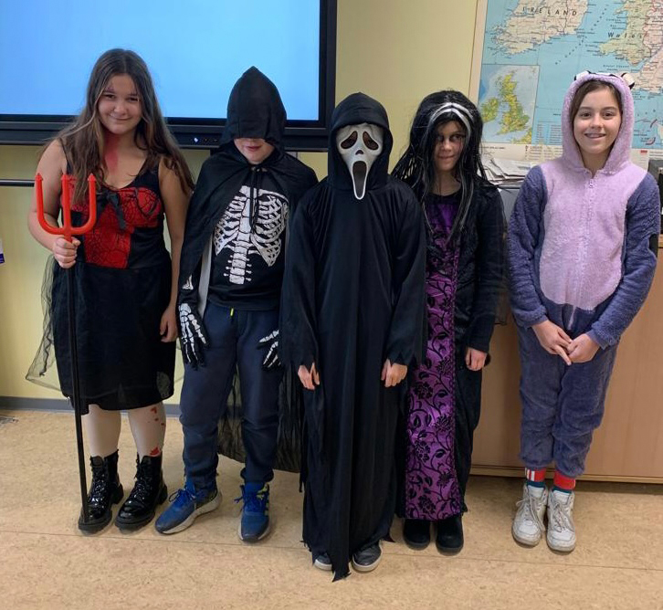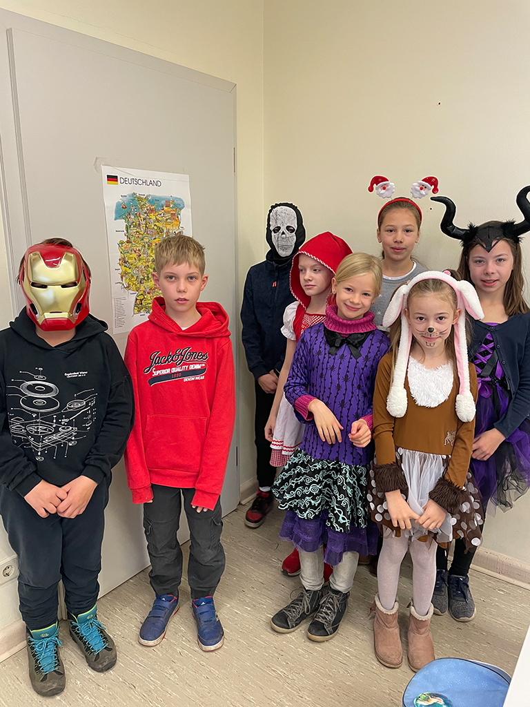 Der Unterricht fand in gewohnter Weise statt. Einige brachten Pfannkuchen mit und erfreuten sich in den Pausen über die lustigen, gruseligen oder fantasievollen Kostüme.