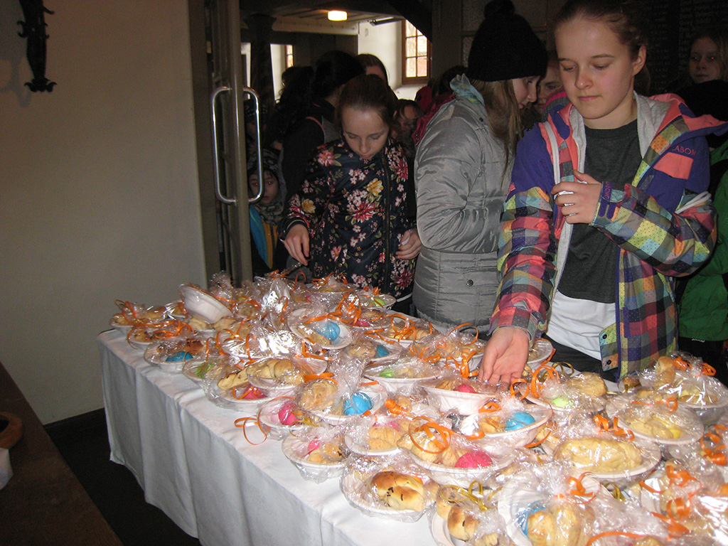 Am Ausgang wartete dann auf jedes Kind eine Schale mit einem Osterbrot und einem Osterei.