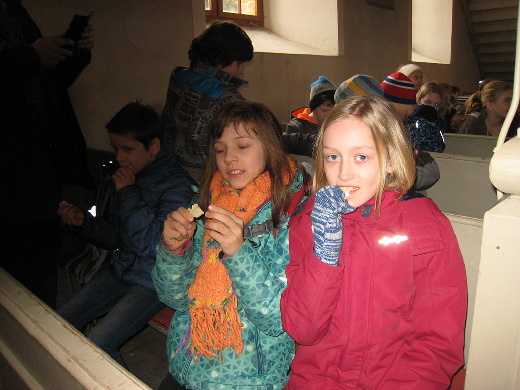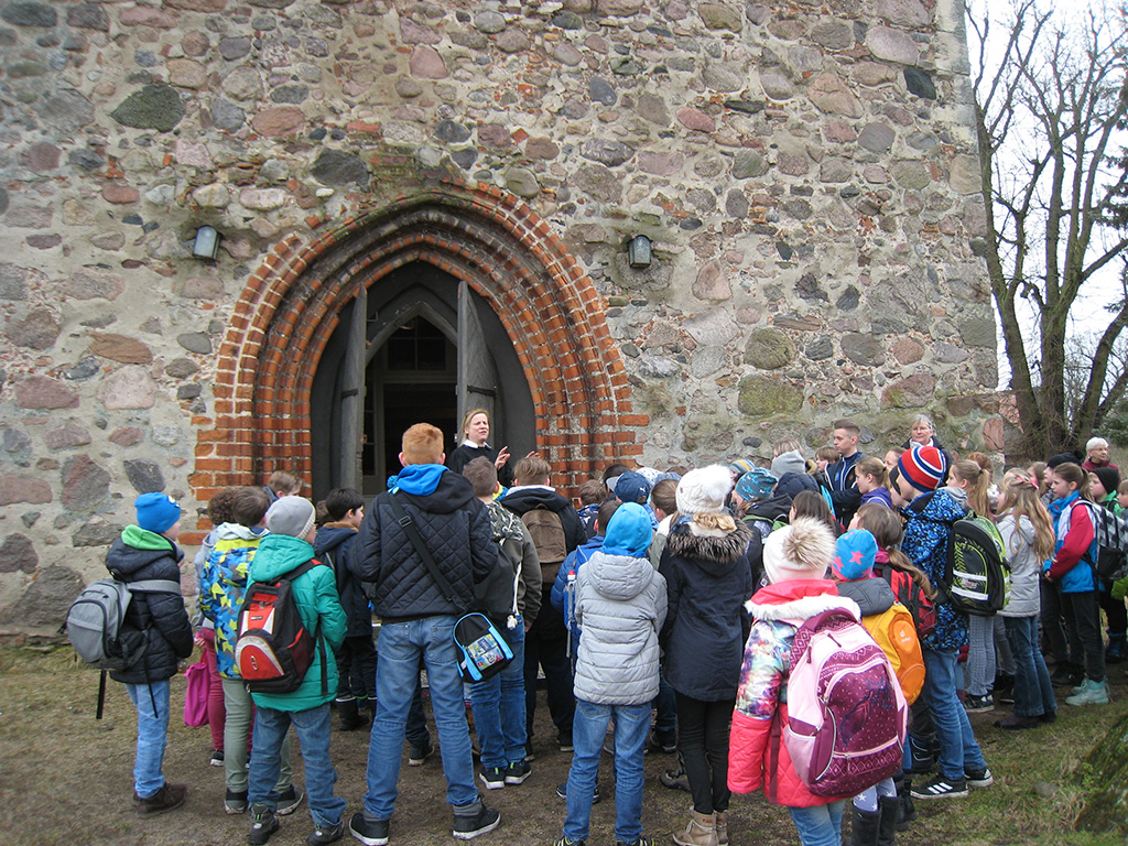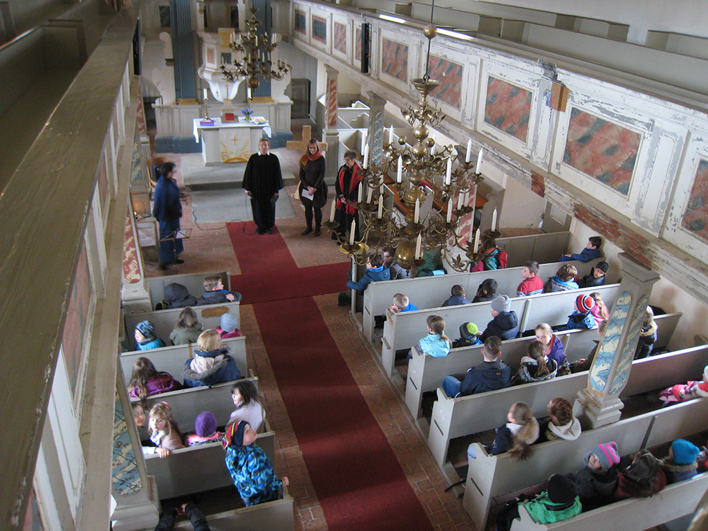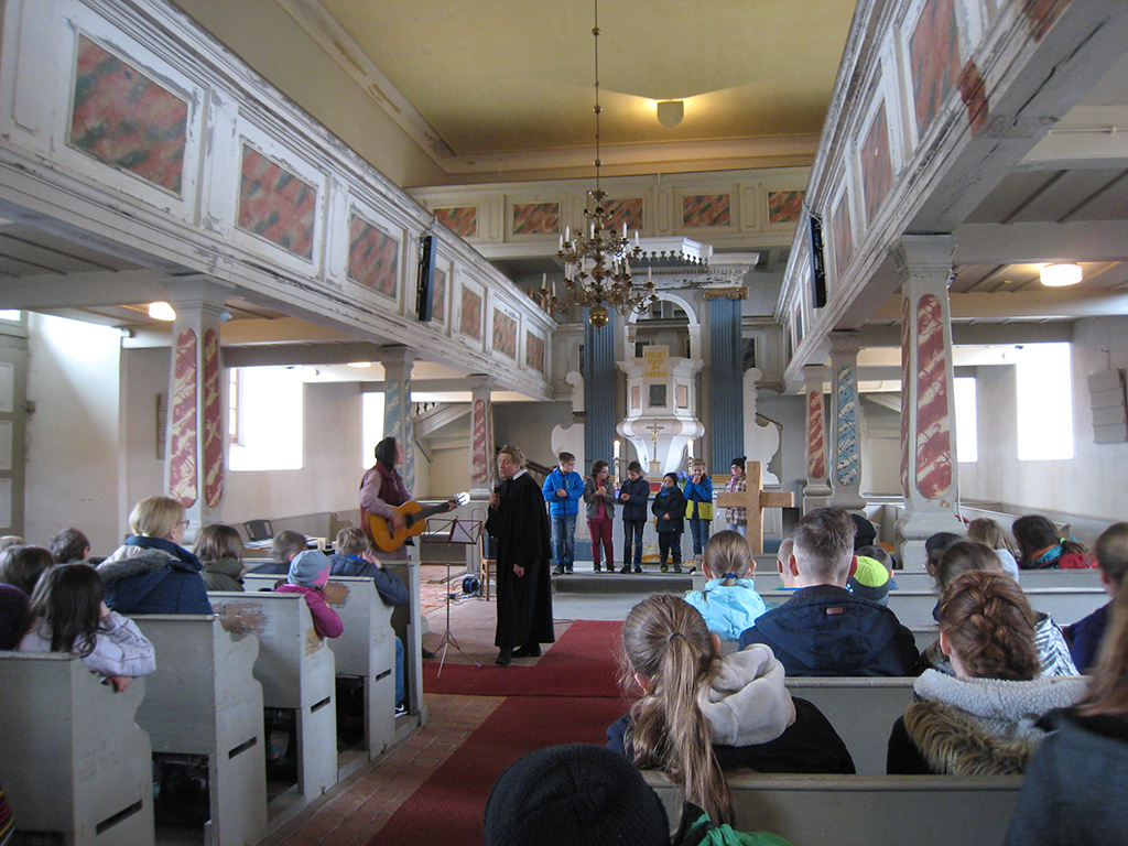 Gegen 10.45 Uhr versammelten sich alle Schüler und Schülerinnen und gingen gemeinsam zur Kirche, wo Frau Müller, Frau Torge, Frau Winkelmann, Frau Bönke und Frau Gartenschläger schon auf uns warteten. Unter den Klängen der Orgel nahmen alle Platz. Frau Müller und ihre Helferinnen sangen mit uns, erzählten die Ostergeschichte und teilten ungesäuertes Brot mit uns. Zum Abschluss konnte jedes Kind ein Leporello zur Ostergeschichte mitnehmen.