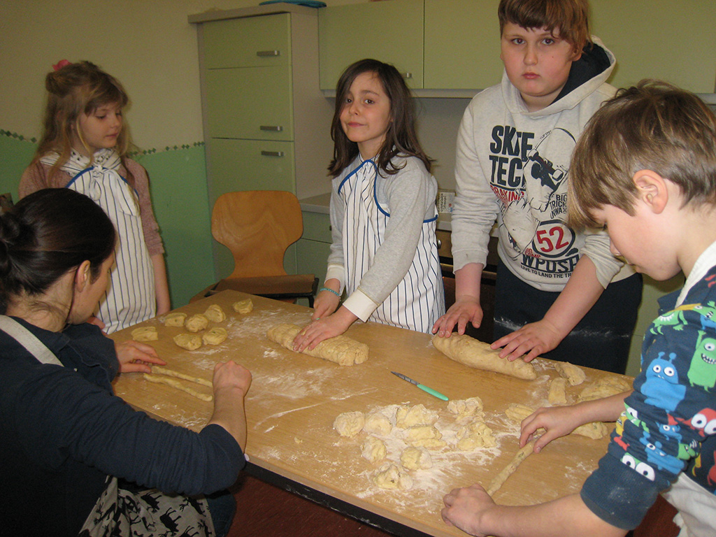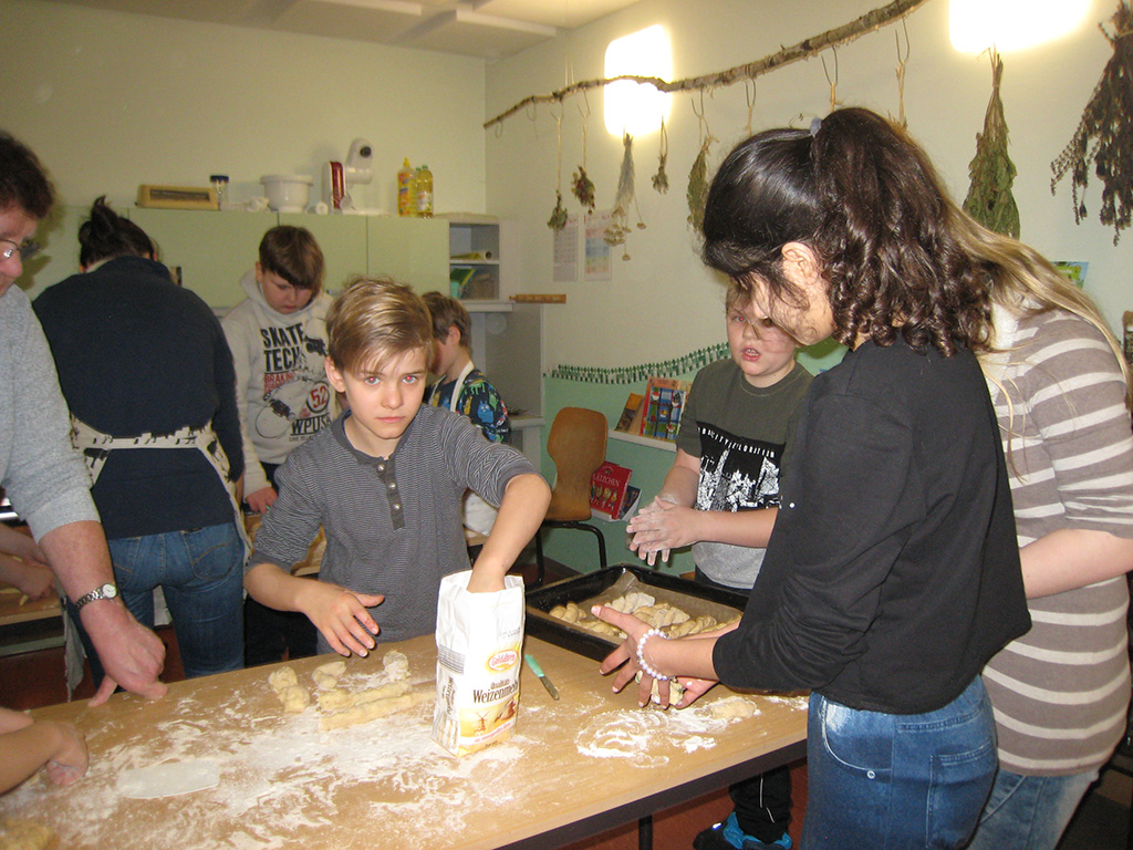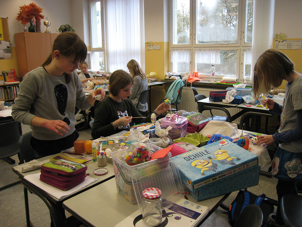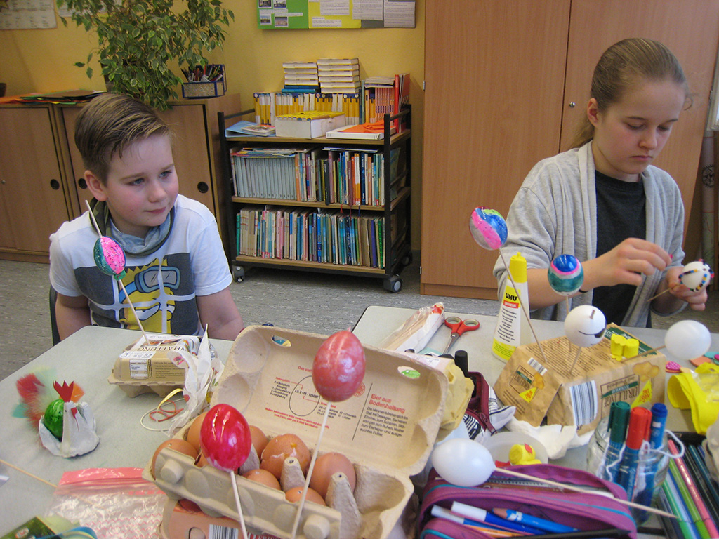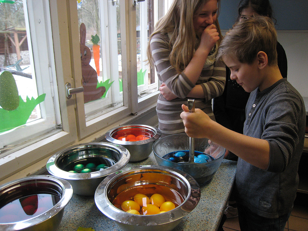 Unter der Anleitung des Koches Rainer Görling und 5 fleißigen Helferinnen waren 2 Gruppen in den Küchen der Kita „Borstel“ und des Jugendzentrums „Scheune“ damit beschäftigt, Ostereier zu färben und kleine Osterbrote zu backen. Alle anderen Schüler setzten sich in der Zwischenzeit mit dem Thema Ostern auseinander. Warum feiern wir Ostern? Welche Bräuche gibt es? Außerdem wurde in den Klassen fleißig gebastelt, Ostereier bemalt, Karten geschrieben und Kressetöpfchen ausgesät. Dabei zeigten die Jungen und Mädchen viele kreative Ideen und Einfallsreichtum. So verging der Vormittag wie im Flug.