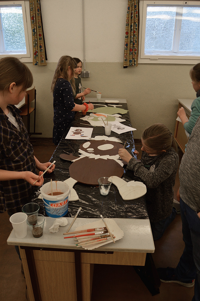 Die älteren Schüler arbeiteten in gemischten Gruppen. Sie informierten sich am PC über das Leben von Walter Krumbach und seine Bücher. Mit Martin Falk vom Jugendzentrum ging es um Körpermusik und Rhythmusinstrumente, Frau Schemel vom KSB tanzte mit den Schülern in der Turnhalle verschiedene Choreografien und eine Gruppe bemalte große Holzfiguren aus den Sandmanngeschichten, die zum Tag der offenen Höfe die Fassade der Schule schmücken sollen. Vielen Dank an Herrn Klemke bei der Hilfe zur Materialbeschaffung. Ein besonderer Dank gilt neben allen Helfern und Unterstützern auch Herrn Aschermann, der für uns die Sägearbeiten übernahm.