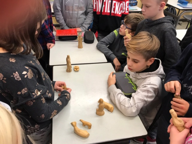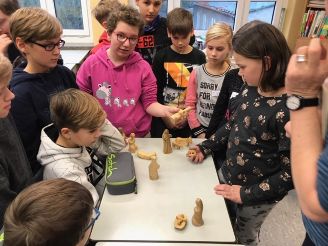 Frau Müller las die Weihnachtsgeschichte vor. Mit Krippenfiguren aus Olivenholz – in Israel hergestellt- stellten wir diese nach und redeten darüber, was für uns zu Weihnachten wichtig ist.