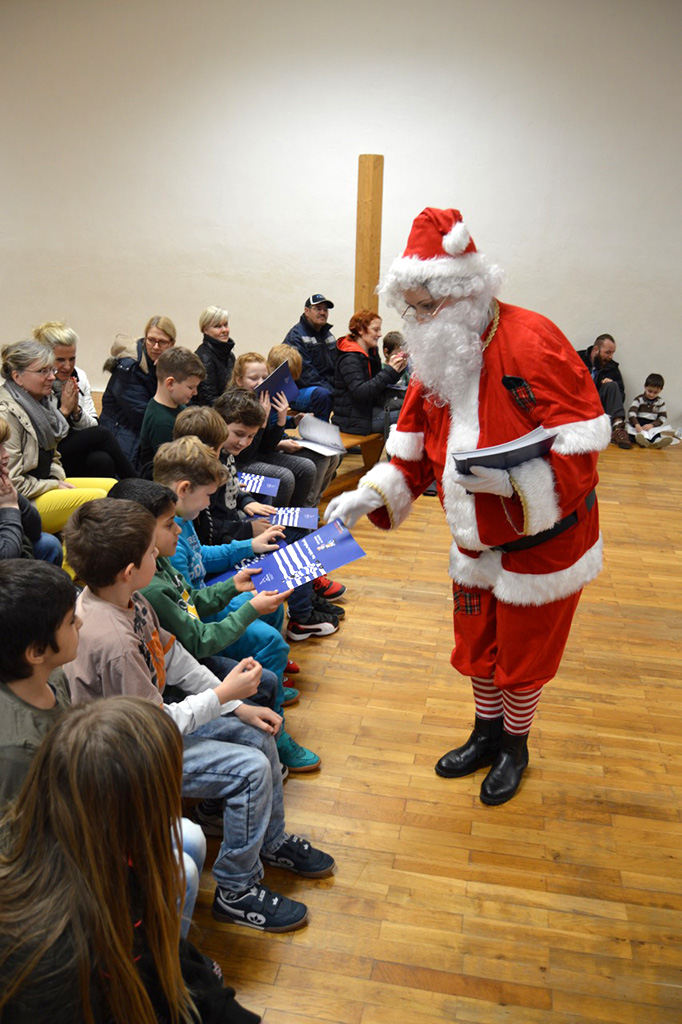 So konnte am Ende der Weihnachtsmann doch schon die ersten Geschenke verteilen und alle Kinder bekamen ein Malbuch zum Thema „Sicher unterwegs zur Schule“.