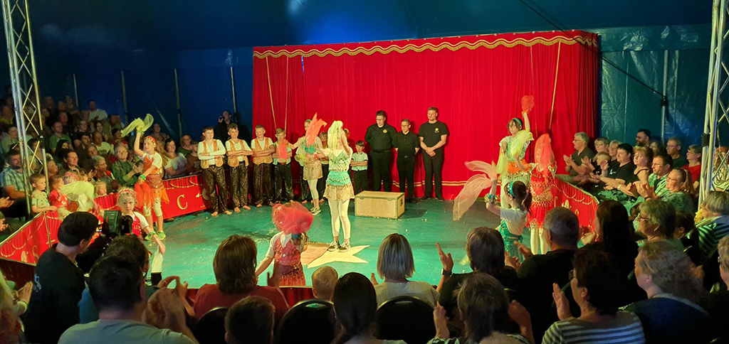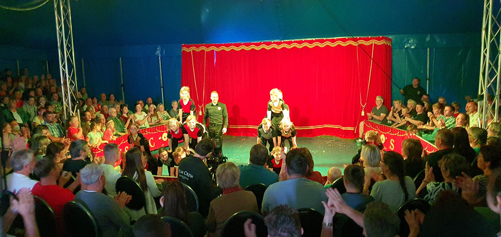 Gemeinsam mit den Kindern der Vorschulgruppe probten alle Schüler/innen der 1. bis zur 6. Klasse 3 Tage für die große Galavorstellung. Wir trafen uns vorher an der Schule und liefen gemeinsam geschminkt und in unseren Kostümen zum Zelt. Mit dem Eröffnungstanz begann die Show. Über 300 Zuschauer jubelten uns begeistert zu. Bei lauter Musik und buntem Licht zeigten wir, was wir gelernt hatten. Von A wie Akrobaten, über Clowns, Cowboys, Cowgirls, Fakire, Hula Hoop, Neontücher, Tellerdreher bis Z wie zauberhafte Show war alles dabei, und so bekamen wir viel Applaus.